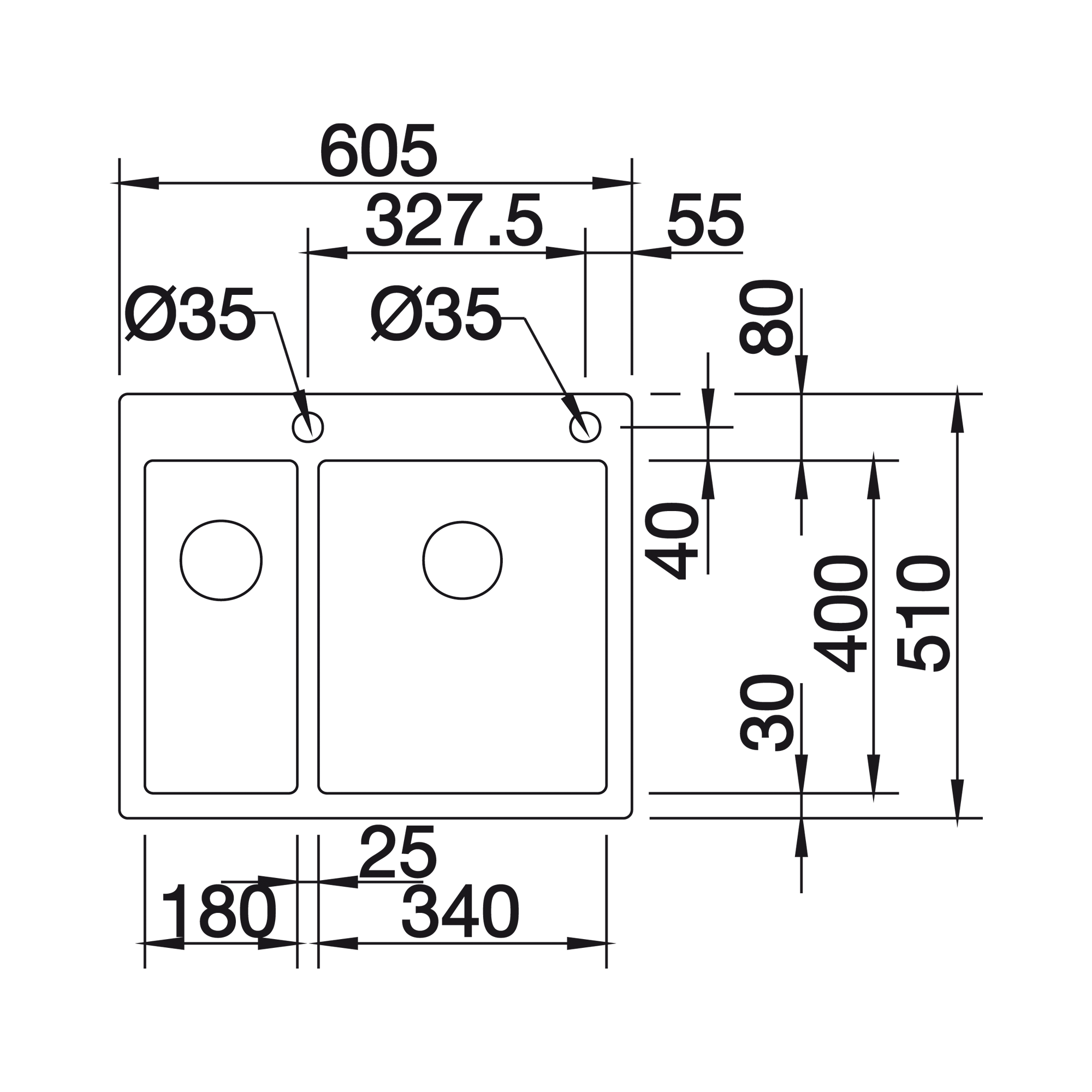 | Wymiary zlewozmywaka | 605/510 mm |